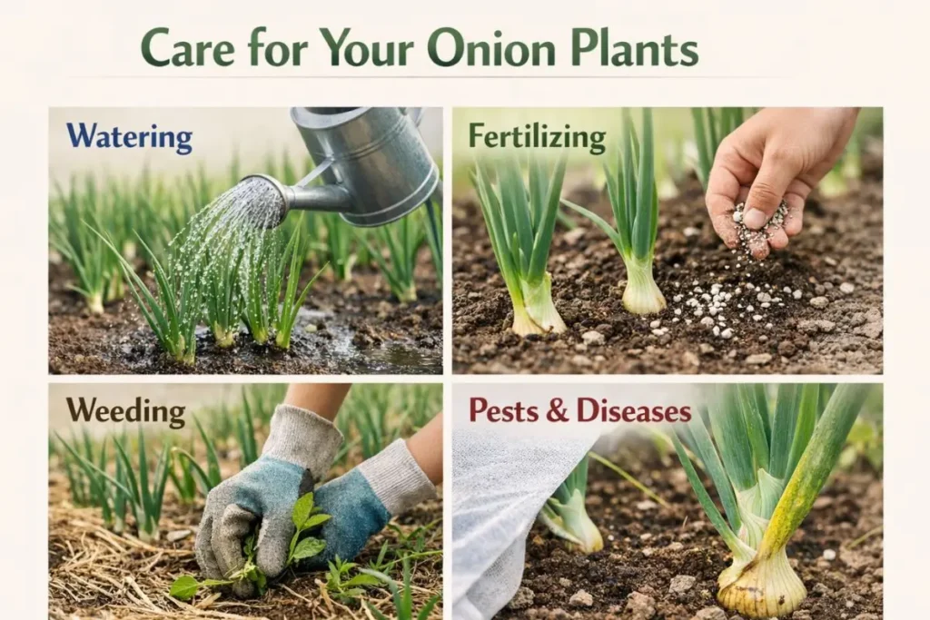 Once your onions are planted, proper care will help them grow strong and healthy. Here’s what you need to do: